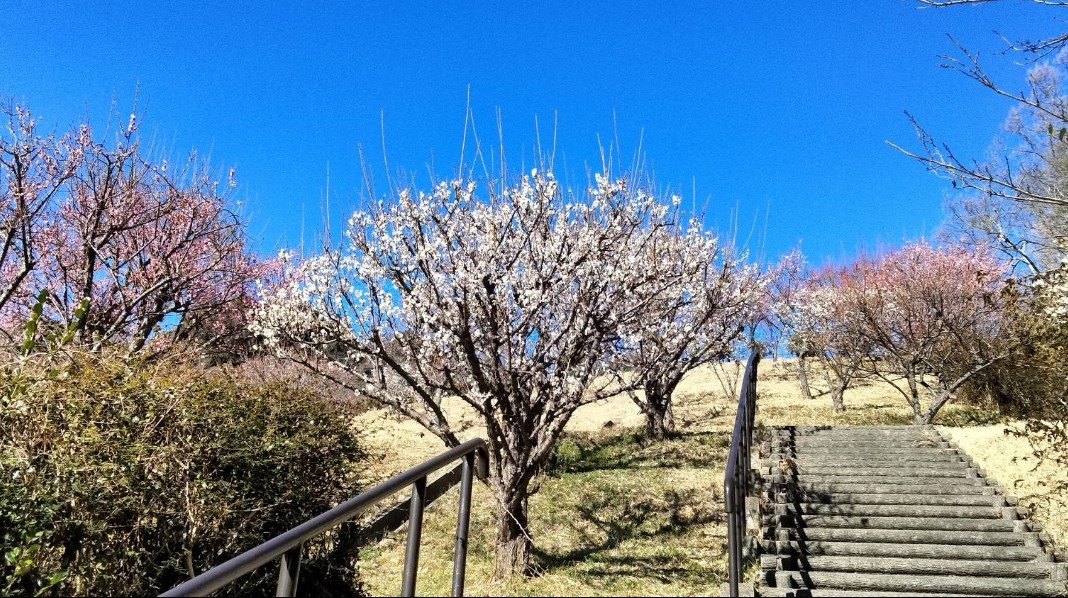 紅と白の梅が咲いています。こんな美しい紅白の梅が咲いている階段を登ってみたいです。