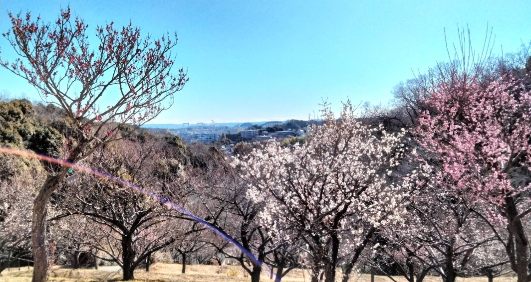 アイキャッチ画像は紅白の梅の木から遠くの景色が望め、虹がかかっているとても